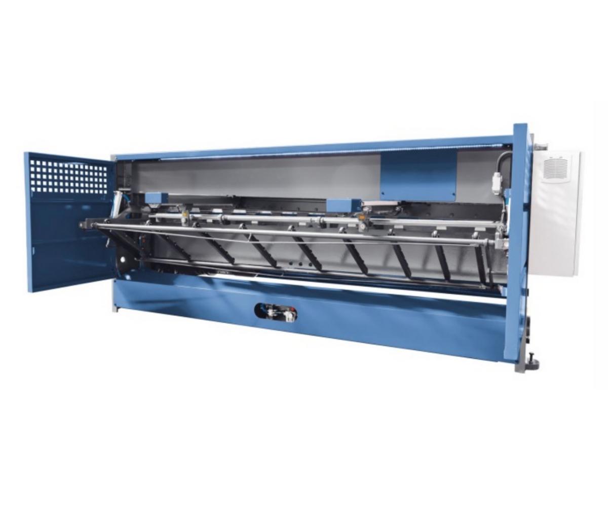 Электромеханические гильотинные ножницы с наклонным ножом для рубки листового металла. Длина рубки 3020 мм, максимальная толщина до 3 мм