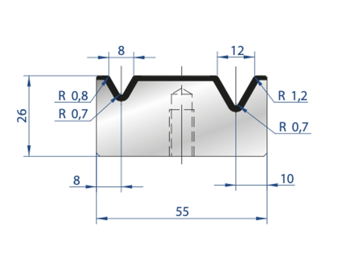 Матрица предназначена для гибки деталей различной формы из листового металла. Ее изготавливают из инструментальной стали, а рабочие поверхности закалены методом индукционной закалки. Инструмент выполнен с повышенной точностью и подвергнут шлифованию. Ширина раскрытия матрицы, ее угол и максимальная нагрузка выбираются в зависимости от параметров изделий, которые необходимо получать.
