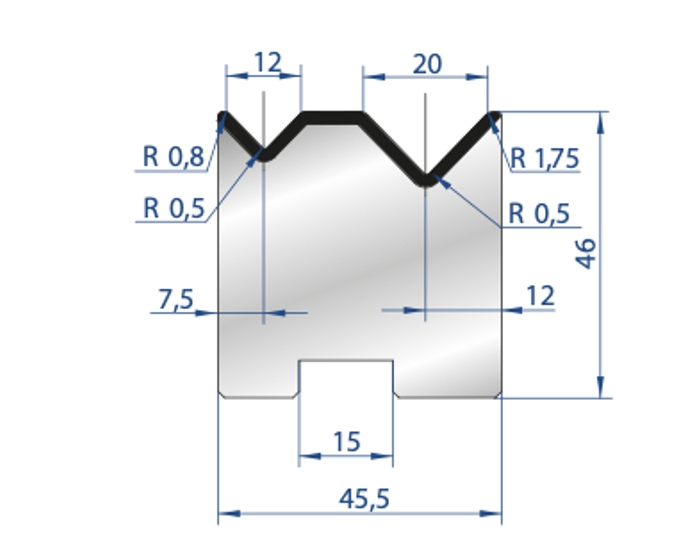 Матрица предназначена для гибки деталей различной формы из листового металла. Ее изготавливают из инструментальной стали, а рабочие поверхности закалены методом индукционной закалки. Инструмент выполнен с повышенной точностью и подвергнут шлифованию. Ширина раскрытия матрицы, ее угол и максимальная нагрузка выбираются в зависимости от параметров изделий, которые необходимо получать.