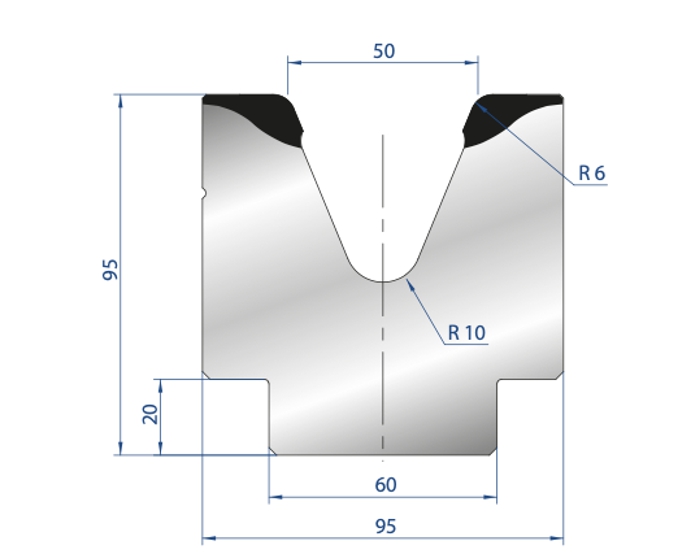 Матрица предназначена для гибки деталей различной формы из листового металла. Ее изготавливают из инструментальной стали, а рабочие поверхности закалены методом индукционной закалки. Инструмент выполнен с повышенной точностью и подвергнут шлифованию. Ширина раскрытия матрицы, ее угол и максимальная нагрузка выбираются в зависимости от параметров изделий, которые необходимо получать.