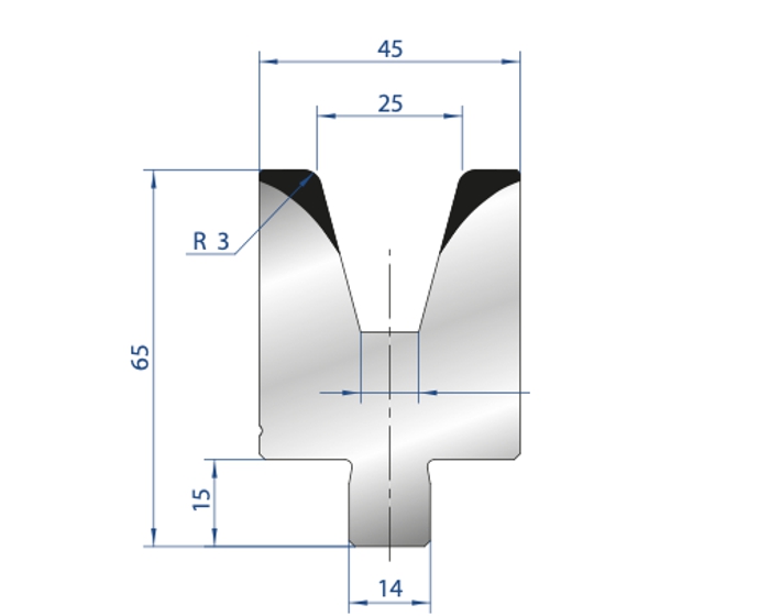 Матрица предназначена для гибки деталей различной формы из листового металла. Ее изготавливают из инструментальной стали, а рабочие поверхности закалены методом индукционной закалки. Инструмент выполнен с повышенной точностью и подвергнут шлифованию. Ширина раскрытия матрицы, ее угол и максимальная нагрузка выбираются в зависимости от параметров изделий, которые необходимо получать.