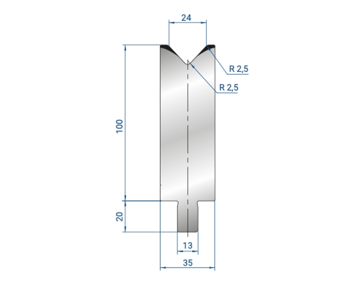 Матрица предназначена для гибки деталей различной формы из листового металла. Ее изготавливают из инструментальной стали, а рабочие поверхности закалены методом индукционной закалки. Инструмент выполнен с повышенной точностью и подвергнут шлифованию. Ширина раскрытия матрицы, ее угол и максимальная нагрузка выбираются в зависимости от параметров изделий, которые необходимо получать.