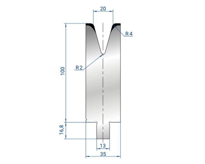 Матрица предназначена для гибки деталей различной формы из листового металла. Ее изготавливают из инструментальной стали, а рабочие поверхности закалены методом индукционной закалки. Инструмент выполнен с повышенной точностью и подвергнут шлифованию. Ширина раскрытия матрицы, ее угол и максимальная нагрузка выбираются в зависимости от параметров изделий, которые необходимо получать.